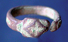 A small finger key with a raised rhomboid shape on the facet incised with a cross. Broken in antiquity.