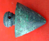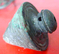 Hole in top of knob and another obliquely through side of knob Decorated by concentric lines,