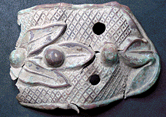 | Description | A larger end fragment of a pressed metal strip, with berry and leaf pattern. Background is patterned with with crossing lines forming small diamond patterns with a dot in the middle. | |