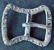 A medieval "butterfly" buckle with pin intact. Decorated with triangular marks
