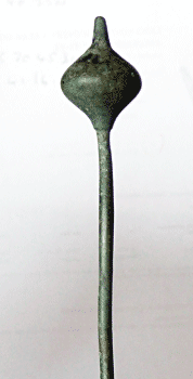 A fragment of a celtic bronze pin with heavy biconal knob terminal.