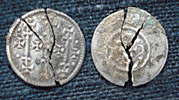 | Description | A struck denar coin of Geza II with a design of poles, crosses and dots. The reverse is mainly blank with a cross with crescents in the centre enclosed in a circle. Shattered by tractor wheel. Ref: Huszár 180 |