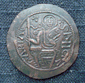 | Description | A struck copper coin of Bela III with two figures enthroned. Reverse shows single seated figure with halo. Ref: Huszár 072 |