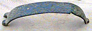 A possible hinged bracelet half, with catch at one end and hinge at other. Decorated along it's length with inscribed symmetrical patterns.