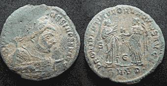 | Description | Obverse: laureate bust right in imperial mantle. Reverse: Providentia standing facing right, extending right hand to Quies, facing left, holding branch & leaning on scepter | ||