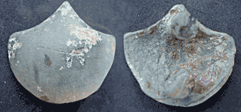 A hollow "axe-blade" or scallop shaped mount with two fixing studs.