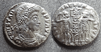 | Description | Obverse: Bust right. Reverse:Two soldiers with single standard, chi-rho on standard | ||