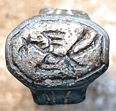 | Description | A small, cast ring with narrow, oblong face inscribed with a flying creature. Ring is also decorated with incised lines on each side. Band missing. Casting sand visible embedded in face. | |