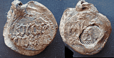 | Description | A cloth seal of two circular parts linked by a narrow strip. Stamped designs show gothic text on one side and a crown on the other. | |