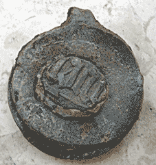 A cloth seal of two circular parts linked by a narrow strip. Stamped designs show gothic text on one side.