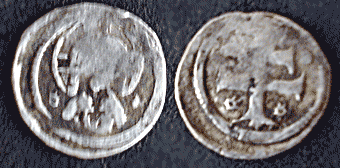 An obol of Bela IV with haloed head of Christ on one sides. Reverse a patriarchal cross with four rosettes. Ref: Huszár 319