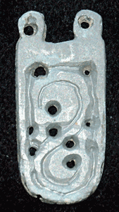 | Description | An openwork strap end with flat front plate with a shallow raised rim on reverse to fit over the leather strap. Two flat lugs with rivet holes. In the lower section there is a design of a stylised reversed S. |