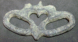 | Description | This cast item has been identified as a balteus connecter, but it's heavy build suggests it has an equine use. The three loops would each hold a leather strap. Two raised nubs once held an attachment that was allowed to swivel freely. The reverse is flat. This example is broken in half. | |