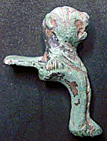 Lion-shaped leg from a small pot or cauldron. There is a hole through the side of the mouth to take a ring for hanging..
