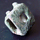 A hollow, domed strap slide. Square hole in centre of base, two nubs on one side.