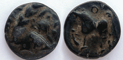 | Description | A "Kugelwange" silver coin. Copied from Macedonian Drachma. Obverse shows details of stylized head with laurels facing right; reverse shows a horse with annulet above. | |