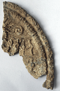 The top left hand fragment of a circular lead plaque attributed to the 4th century 'Rider cult'.