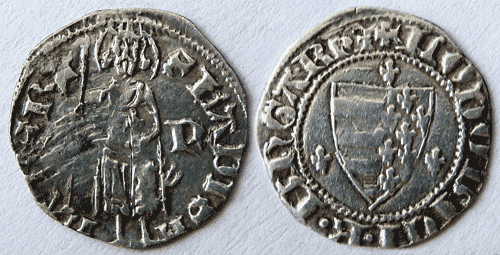 | Description | Obv: shield with three lilies above and to the sides ; Rev: King wth halbard. Mintmark: P Ref Huszár 542 |
