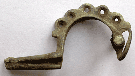 | Description | An early crossbow type with raised crest along bow of five holed arches. The holes are counter sunk. the pin is intact but badly bent. | |