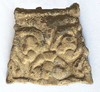 A cast trapezoidal mount with two nubs on reverse. Design of Fleur de Lys.